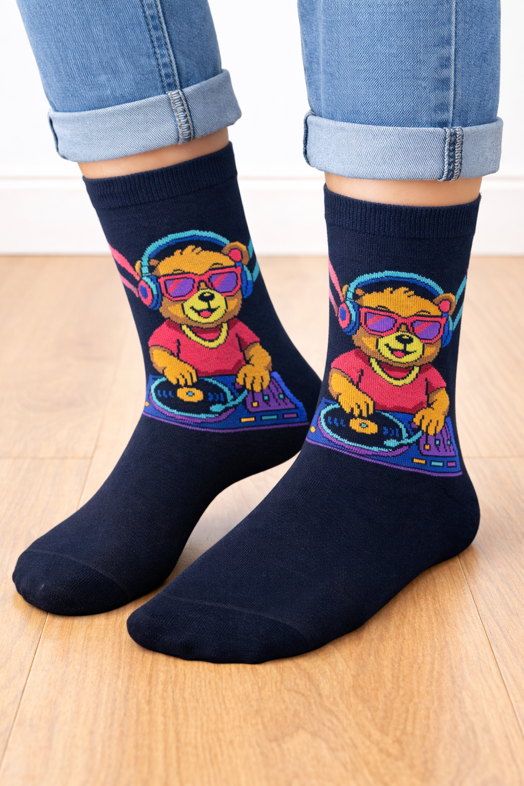 جوراب فانتزی نخ پنبه ساقدار Unisex طرح خرساز الیاف نخ پنبهی نرم و تنفسپذیر تهیه شده تا برای پوشش روزمره احساس راحتی و لطافت به پاها بدهد.