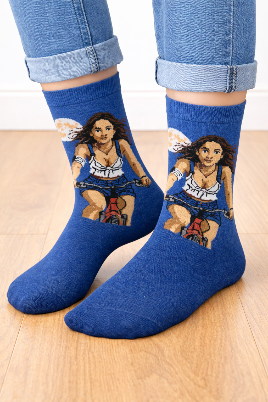طرح دوچرخهسوار در حرکت، روی ساق یا پهلو جوراب جاگذاری شده و در ترکیب با رنگهای آبی آسمانی، سبز زیتونی یا خاکستری خنثی، حس طبیعت و انرژی مثبت ایجاد میکند.